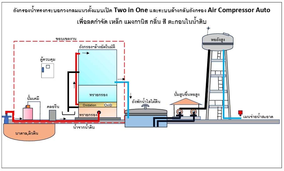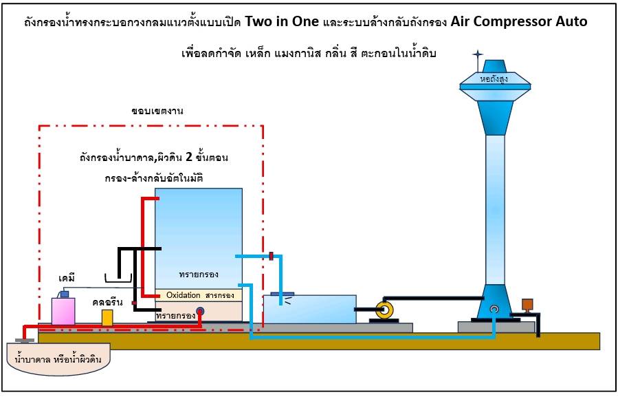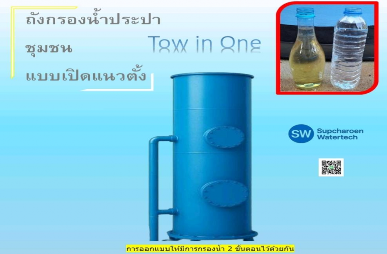 ระบบผลิตน้ำประปา และระบบกรองน้ำ Two In One แบบเปิดแนวตั้ง ป็นระบบแบบ Pressure Vessel Filter และ Gravity Muiti Media Filtration การออกแบบให้มีการกรองน้ำ 2 ขั้นคอนไว้ด้วยกันทำให้กระบวนการกรองได้คุณภาพน้ำที่ดียิ่งขึ้นโดยมีระบบอ๊อกซิเดชั่นด้วยเคมีสำหรับกำจัด,เหล็ก,แมงกานีสกลิ่น (ปัญหาในน้ำบาดาล,น้ำผิวดิา)ที่มีประสิทธิภาพสูง มีระบบเร่งตกตะกอนสารแขวนลอยในน้ำดิบเพิ่มประสิทธิภาพในการกรอง รวดเร็ว และระบบฆ่าเชื้อโรค ประหยัดและปลอดภัย
