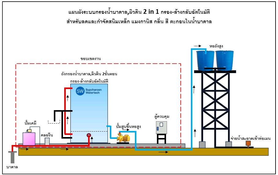 2. ระบบกรองน้ำประปามีระบบกรอง-ล้างย้อนทำความสะอาดสารกรองแบบอัตโนมัติ และระบายตะกอนอัตโนมัติ ด้วยตัวเองเมื่อหน้ากรองตัน เพื่อให้ใด้น้ำใสสะอาด และ เพียงพอต่อผู้ใช้น้ำ และไม่มีผลกระทบต่อการใช้น้ำในชุมชน
